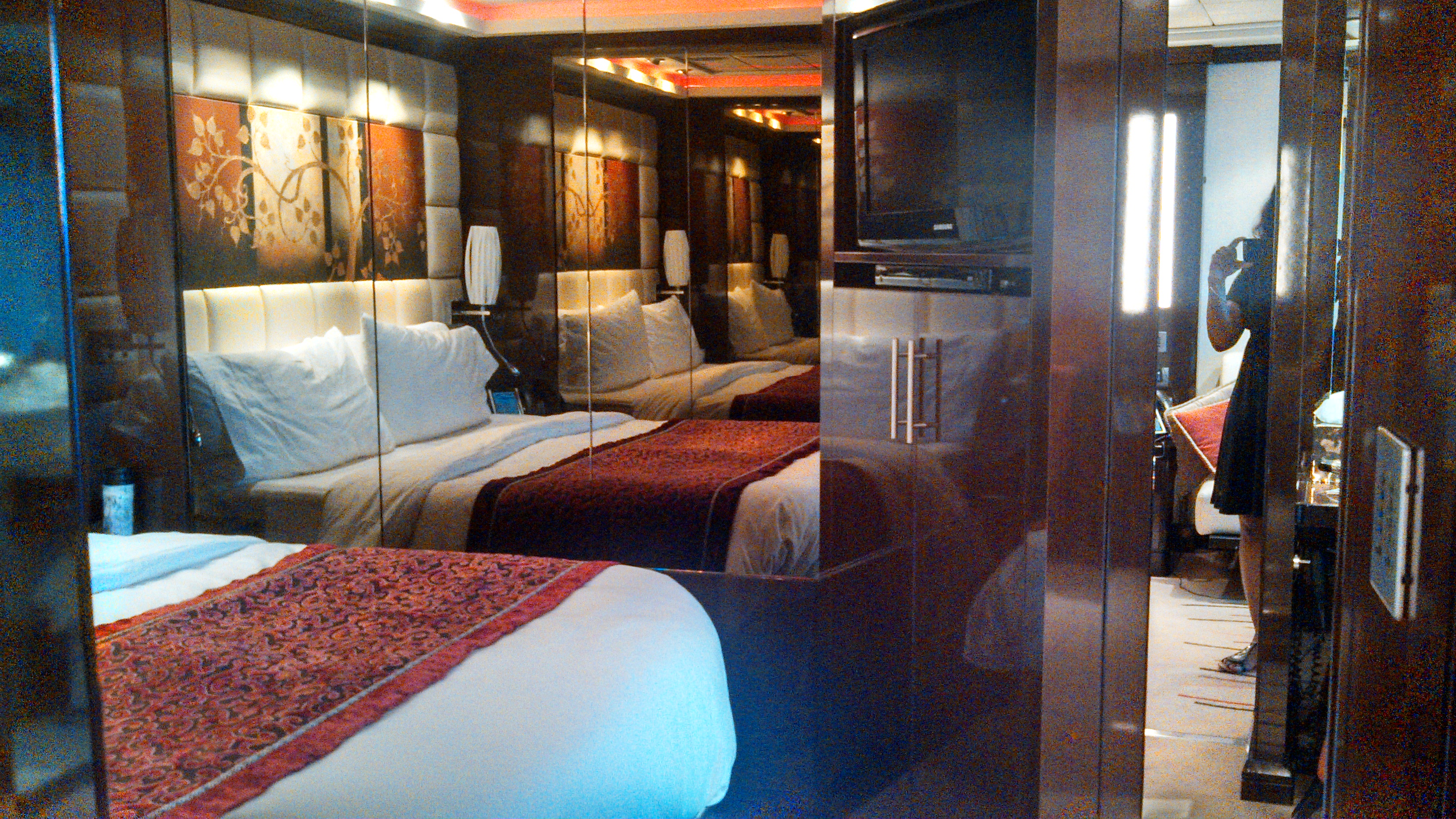 Suite 17003 Location – PROS: being on deck 17 made it easy to walk down to deck 15 where a lot of our day & night life action was so we avoided waiting for elevators: (Garden Cafe buffet and Great Outdoors snacks, water slides, access to sports court, teen club, spice H2O and pool deck evening parties). Down one more flight or quick hop in elevator is Kids Club on 14. Also could hop an elevator straight down to shows & entertainment which are directly below on 6 & 7. CONS: there is a sun deck above so there is noisy chair movement a couple times a day – sometimes early, sometimes midday. I had read this in another review and it was definitely noticeable. I can’t say it ever woke us up or was irritating but you do clearly hear chairs moving and sometimes pounding feet walking above. FYI – my sister heard it in suite 17025 down the hall as well. Another con (if this bothers you): You are at the farthest point at the front of the ship on a deck that does not go from front to back. That means you must go down a couple decks in the elevator, get out and then walk to cross the ship from front to back. Lots of walking. If you want to stay in the Haven that’s going to be true no matter which suite you choose. We didn’t mind the walking, but did learn that we did not love walking thru the smoke in the casino which was heavy at times. We had to pick our “cross thru” deck carefully to get front to aft to avoid the smoke. It was inconvenient sometimes, but all in all, once we had our bearings we didn’t mind too much. If we sail again, I think first choice would be a suite on deck 16 to avoid the noisy sun deck above. But if not available, I would book this room again. Our Are We Staying In Timbuktu Grade = B+