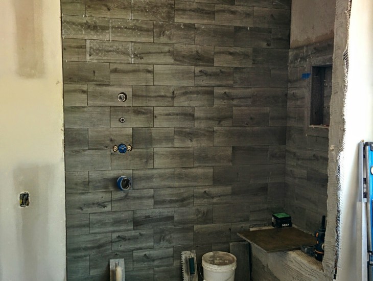 We toured around to each room a bit just to be certain everything we’ve discussed is on track. I discovered I’ll need another light fixture for the guest bathroom – check. We need to start designing the closet organization for the walk in closet – check. Time to get my draper on board – he can start work on the drapery and roman shades that are going throughout the house. I was very excited to see that the tile was going up in the shower in the Master Bath. This is, by the way, the same tile they will lay on the floor. To give a little variation to the walls I asked that the tile be cut in half and put up horizontally with little to no grout line. I didn’t want it to look like we just had left over flooring and oh look it runs right up the wall. So I changed it up just a bit. The client had already purchased this tile when I was brought on board the project. Every once in a while, that is a really tough thing to work around. Not this time. I took inspiration from some fantastic hotel bathrooms I’ve encountered while traveling and came up with a plan to make it work so the floor and the walls could be the same…but different. Everyone is happy so far and we’re making progress!