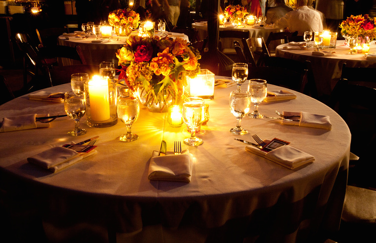 End of Summer dinner party. Set up a cluster of tables outdoors using a simple taupe linen. Fresh flowers are a must. We chose deep colored flowers with added greenery and leaves to invoke the feeling of Fall. Nobody does these better than my favorite florist – Mark’s Garden. Clusters of multi-colored votives in deep fall colors like purple, orange and deep yellow mixed with mercury glass are a simple addition. I picked these up at Cost Plus World Market. To give our outdoor tables the light we needed, we used simple ivory chunky candles in several different heights set in clear glass containers. We didn’t buy these containers though…they’re all old recycled floral vases! (Keep those plain containers your flowers come in!). Even the clear water glasses pick up and distribute the light. Simple entertaining.
