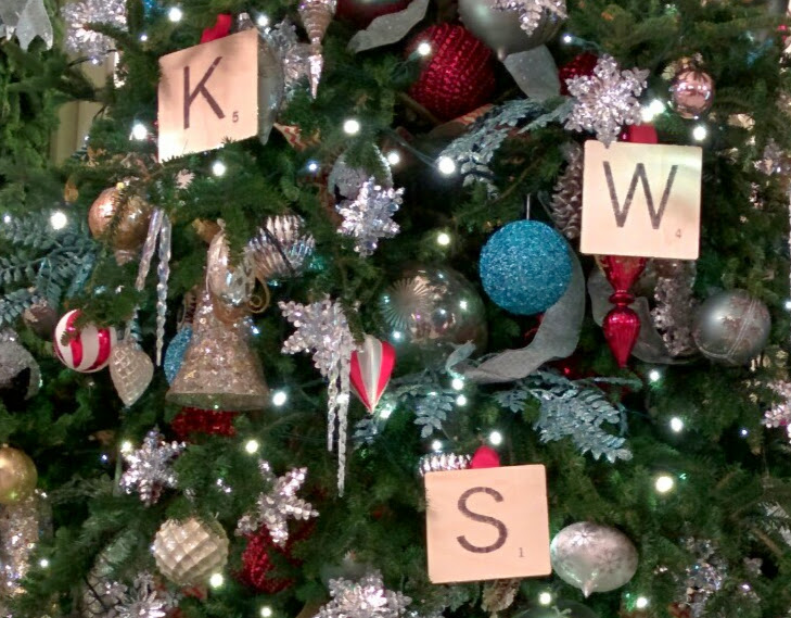 Scrabble whimsy + beautiful non-traditional colored bling mixed in = Gorgeous. Don’t be afraid to layer those ornaments on. LOVE how full this tree is.