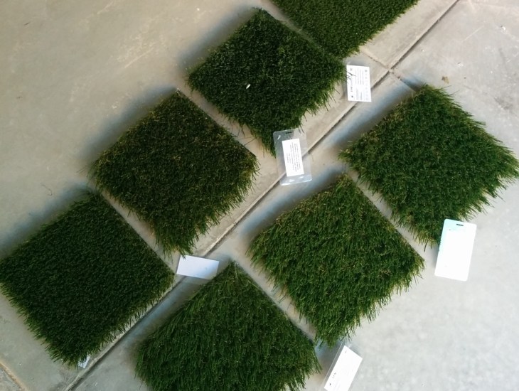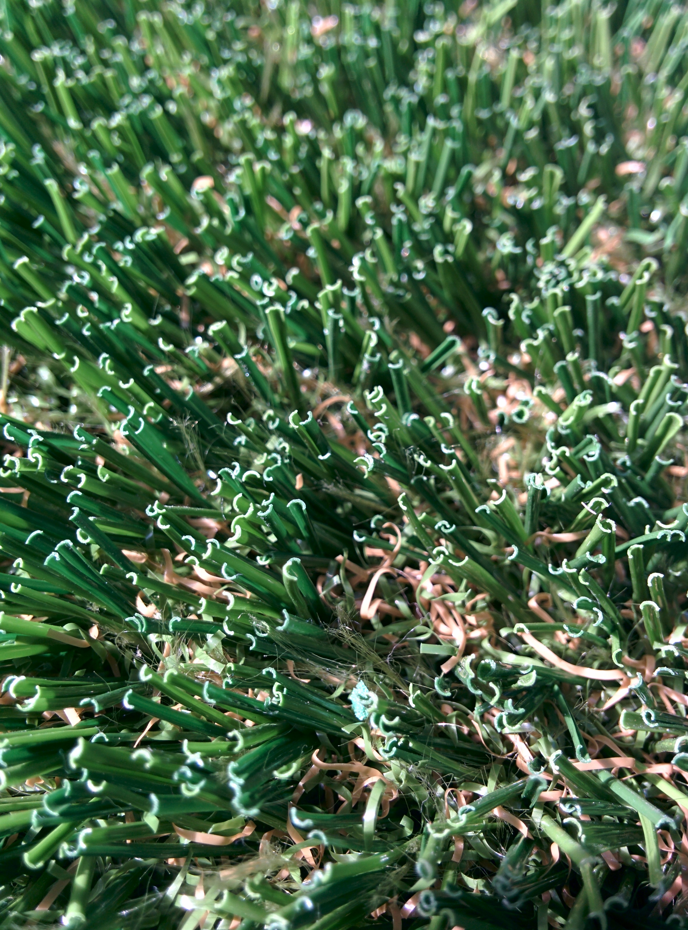 Off to the sunlight with my samples. I was surprised by what I immediately discovered – artificial turf has a nap. Those of you who sew or are around fabric a lot know what that means. Just like fabrics such as corduroy, velvet and suede, artificial turf can look shinier, darker or lighter depending on which direction you look from and how the blades are laying. I also discovered that based on the variety of samples I have, this seems to be based a bit on the brand and price point. It also explains why I’ve never liked the new turf lawn at a nearby house. I now know that the installation wasn’t done correctly and the turf is facing different directions. When we look at the lawn we see shiny, lighter pieces next to darker pieces. It is now crystal clear how important good, professional installation is with this product. We’re pretty good DIY’ers with other things, but uhhmmm…no thanks here. I don’t want my lawn jacked up and I don’t like to waste money.